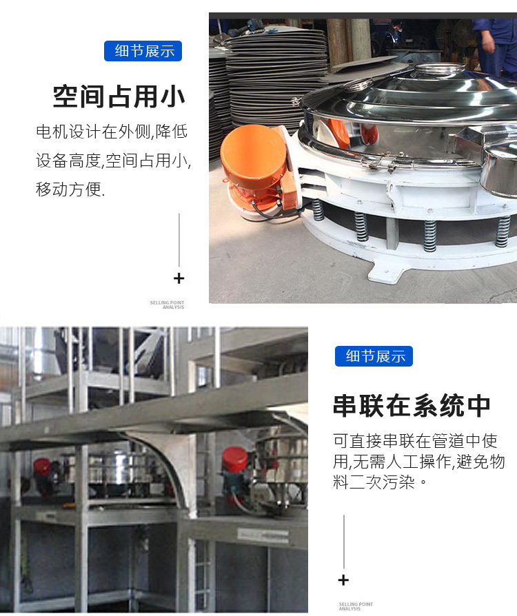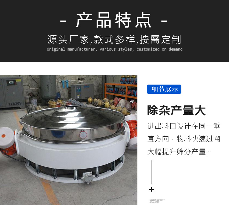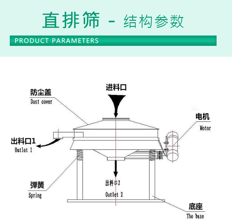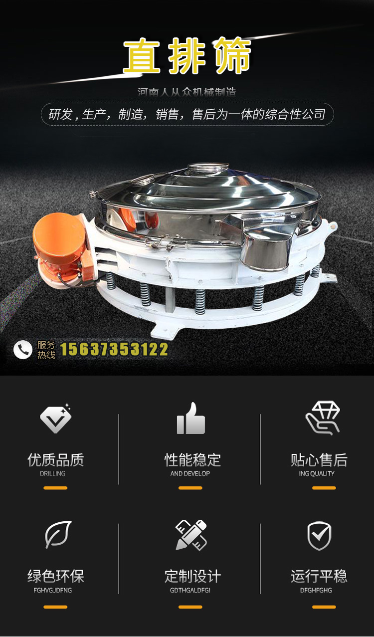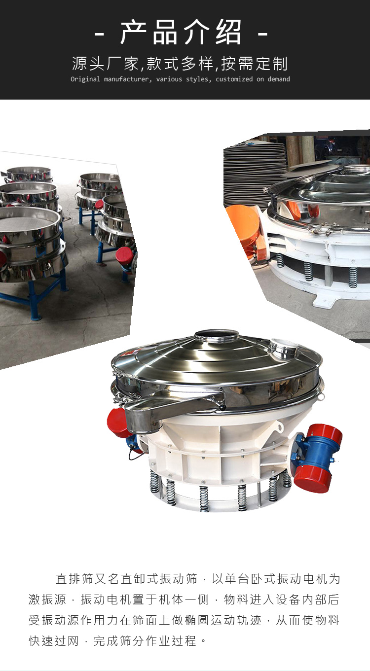 直排篩是以單個或兩個振動電機作為激振源,物料在振動源的作用下以橢圓軌跡運行,可使物料快速通過篩網(wǎng),進料口和出料口在同一垂直方向,極大提高了篩分效率,最終完成篩分過程。