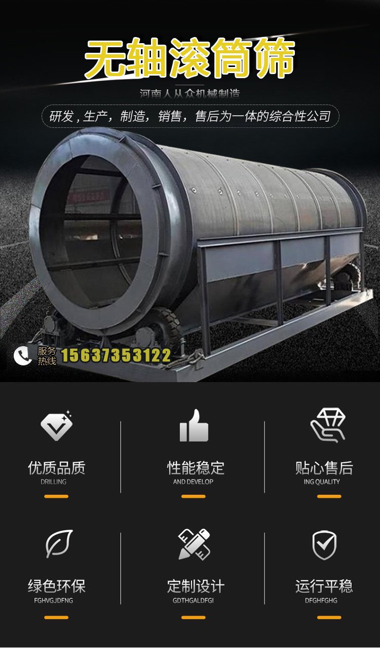 無軸滾筒篩由五部分組成:滾筒裝置、機架、漏斗、減速器和電機。整體與地平面呈傾斜狀態,外部用密封隔離蓋(可選)密封,防止環境污染。通過變速減速系統,篩分滾筒以一定的速度旋轉,物料通過篩分滾筒從上到下分離,細物料從篩分滾筒前端下部排出,物料從篩分滾筒下端或尾部排出。