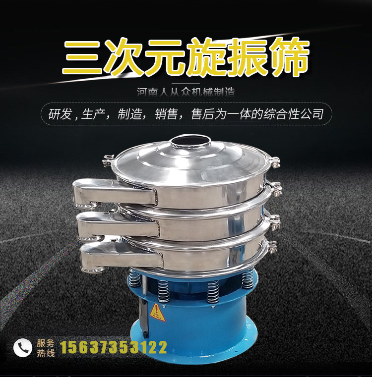 三次元旋振篩,我們可以從字面了解到它的運(yùn)動(dòng)軌跡是三維立體的,它使用直立式電機(jī)作為激振源,在電機(jī)的上端和下端安裝偏心塊,將電機(jī)的旋轉(zhuǎn)運(yùn)動(dòng)轉(zhuǎn)換為水平、垂直和傾斜的三維運(yùn)動(dòng),然后將該運(yùn)動(dòng)傳輸?shù)胶Y面,使物料在篩面上做外擴(kuò)漸開線運(yùn)動(dòng),故該系列振動(dòng)篩稱之為旋振動(dòng)篩。